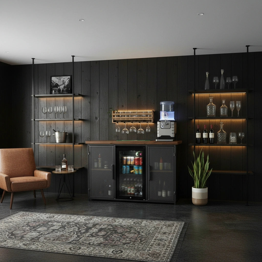 Enhance your home bar with our industrial sideboard cabinet, featuring a built-in beer and wine fridge. Crafted from durable redwood pine and robust mild steel, this drinks cabinet combines rustic charm with modern functionality.
